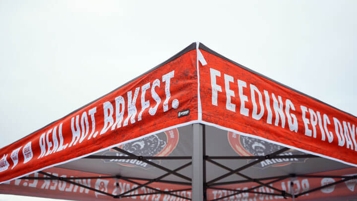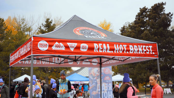 Because of the cold and snowy weather, Kodiak Cakes needed a strong and weather-proof setup for their booth at the Girls On The Run Fall 5k. Their booth had to: