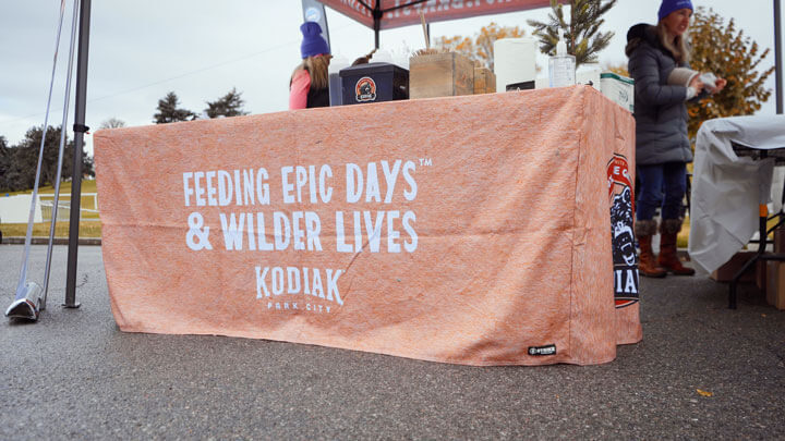 - Custom Printed Table Cover: One of the tables had a bright table cover with the Kodiak Cakes logo. This table served warm pancakes before the 5k race. The table cover made the booth look professional and helped draw people in to try the pancakes.